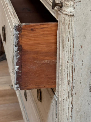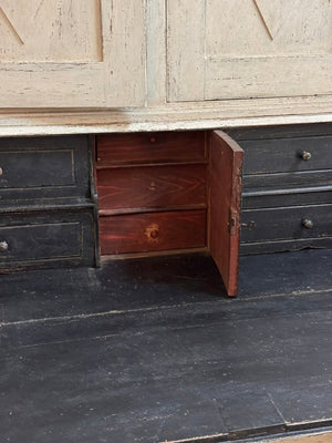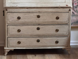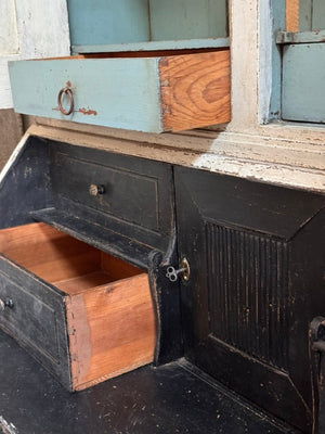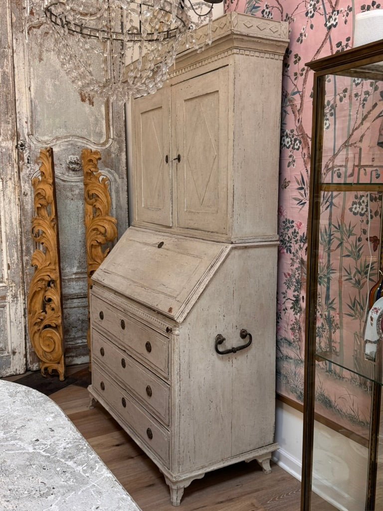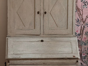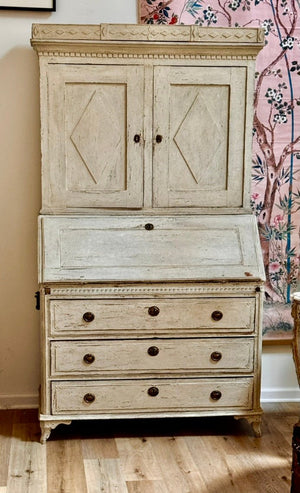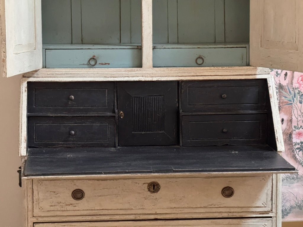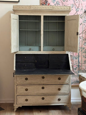 A Gustavian period secretary desk and bookcase likely from Hälsingland, Sweden, crafted in carved pine with dry-scraped original paint. The upper section features diamond-paneled doors and dentil molding, opening to blue-gray painted shelving. The fall-front writing surface reveals a striking black-painted interior fitted with drawers and a central cupboard. Circa 1790, this piece reflects the refined neoclassicism and regional craftsmanship of late 18th century rural Sweden. 84.5” h. x 47.5” w. x 43” d.