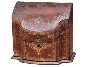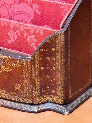 Antique English Embossed Leather Stationary/Letter Box. C. 1900. Decorative box with silk brocade interior and ornate gold detailing on the exterior.