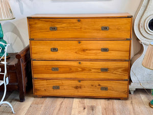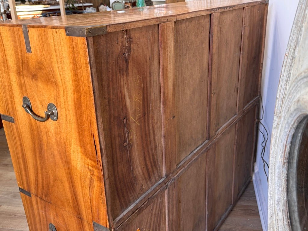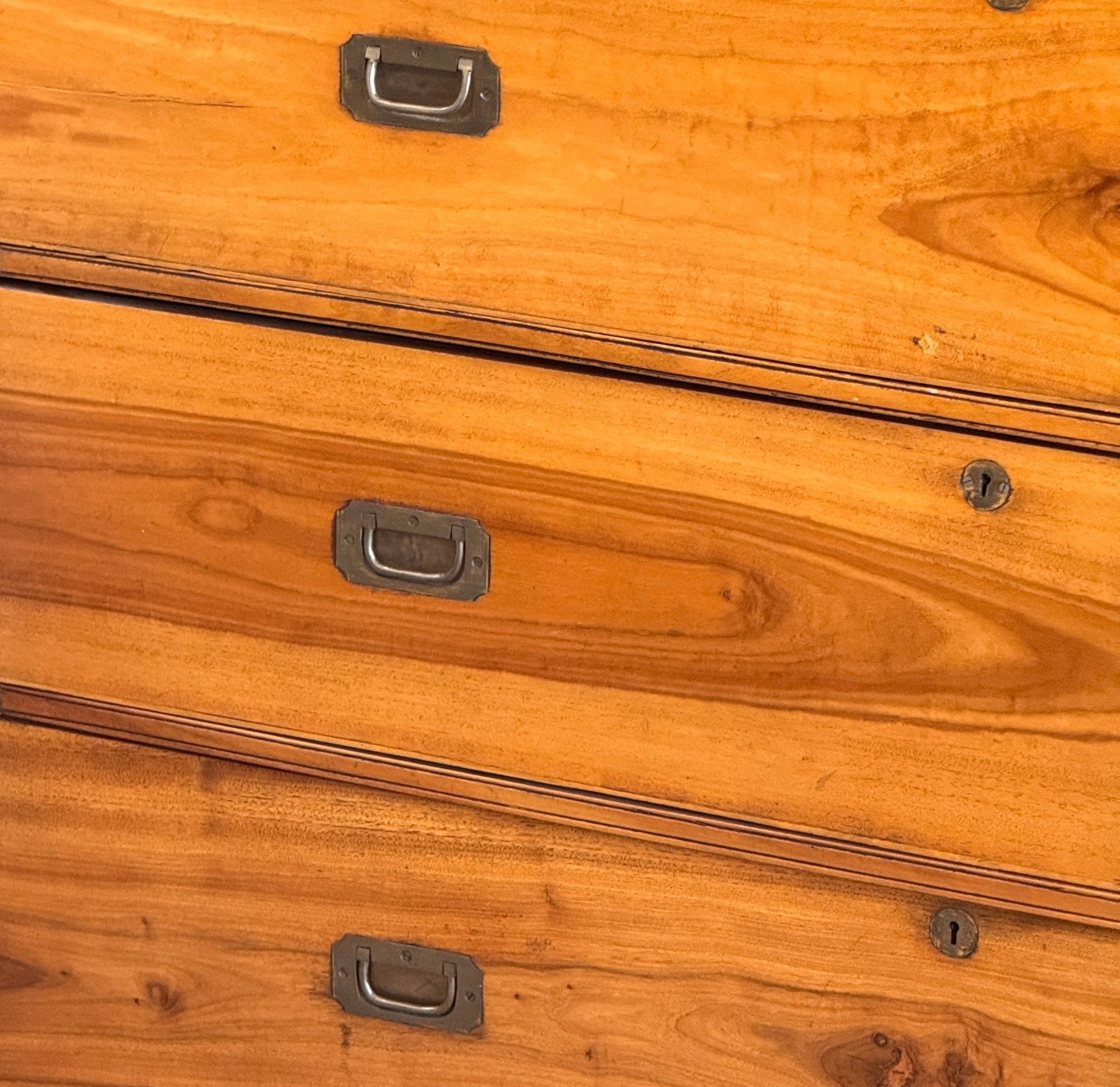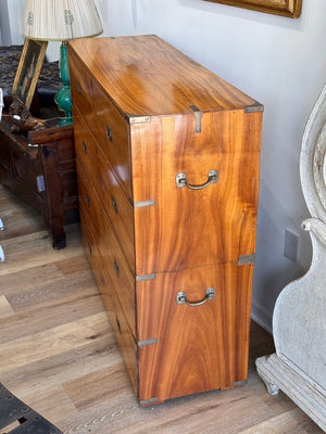 Campaign chest of drawers in camphorwood, Anglo-Indian, mid-19th century. Two-part construction with four drawers, flush brass hardware, and side carrying handles. Raised on block feet with brass corner mounts. Designed for portability, the form reflects British colonial military furniture, with camphorwood prized for its insect-resistant properties in humid climates.