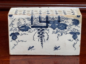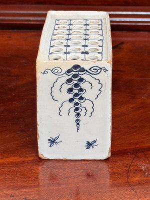 English Delft Flower brick, c. 1760. Having wisteria and insect decoration, 21 holes for flowers and a flat base. 3.5” h. x 6” w. x 2.5” d.