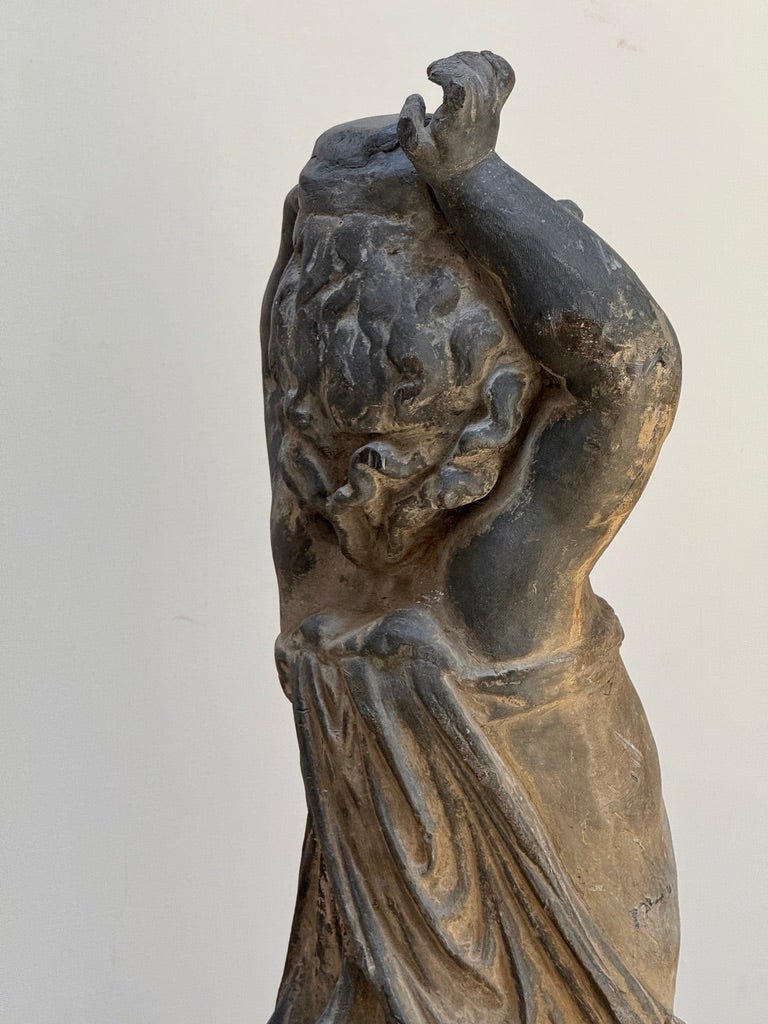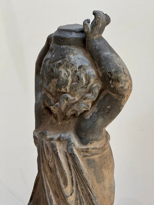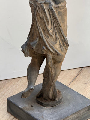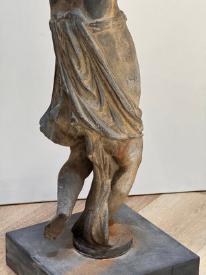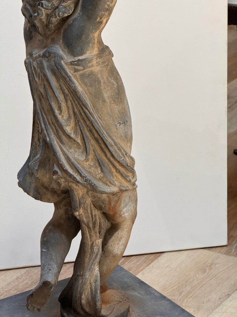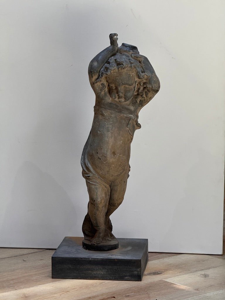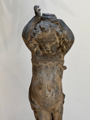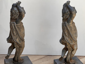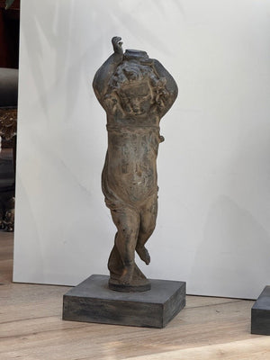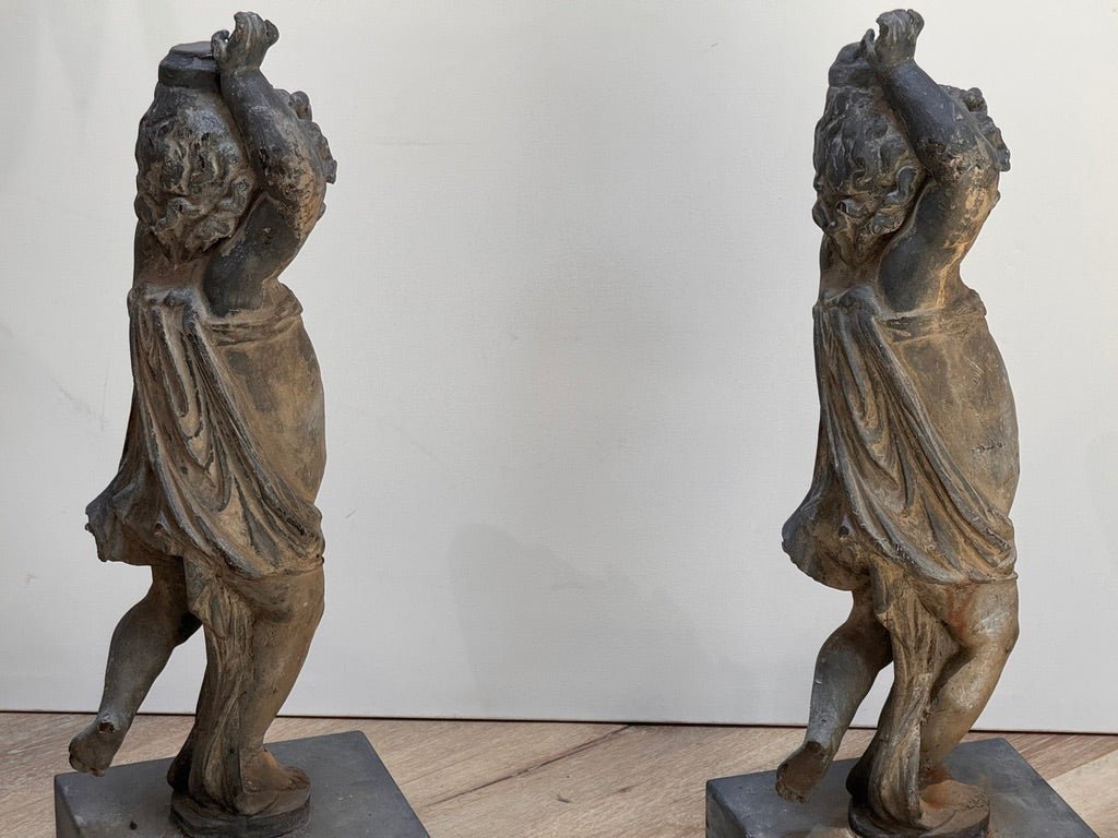 Pair of 18th-century English lead putti, originally intended as architectural or garden ornaments. Young, draped putti in contrapposto stance, each holding their arms aloft—likely once supporting urns, finials, or elements of a larger decorative feature such as a gate pier, balustrade, or fountain surround. C. 1770. h. 28-1/4", w. 10-1/8", d. 9-7/8"