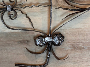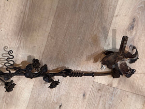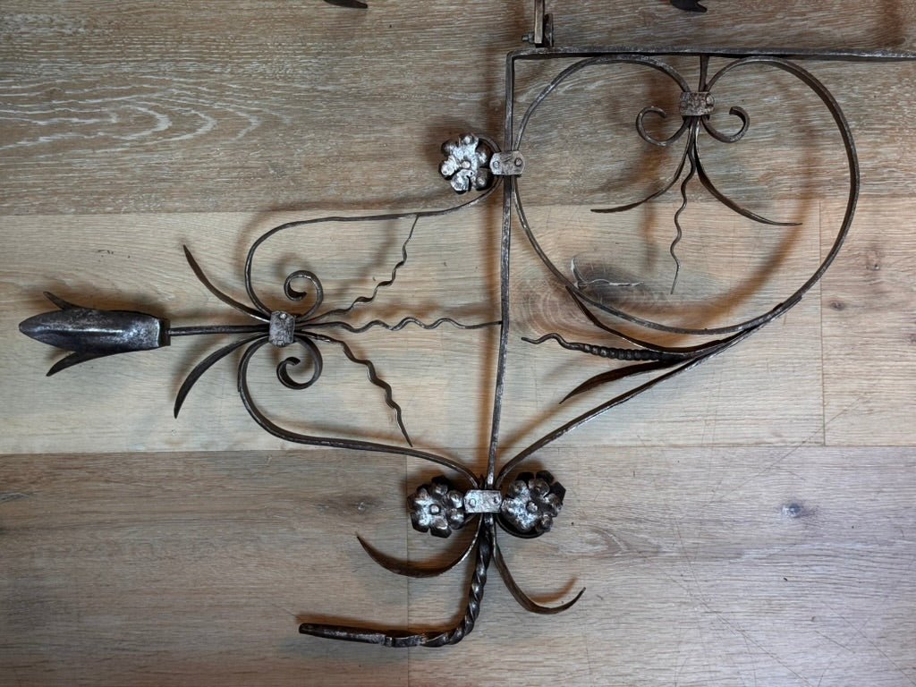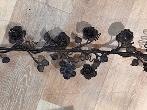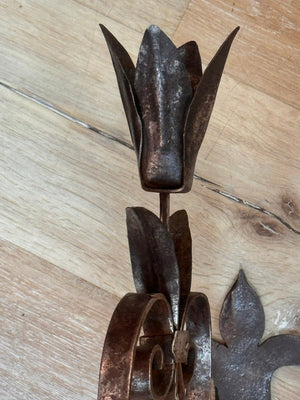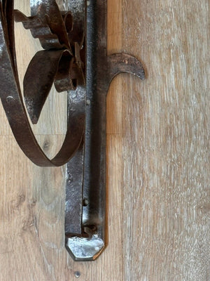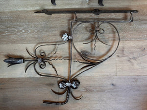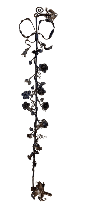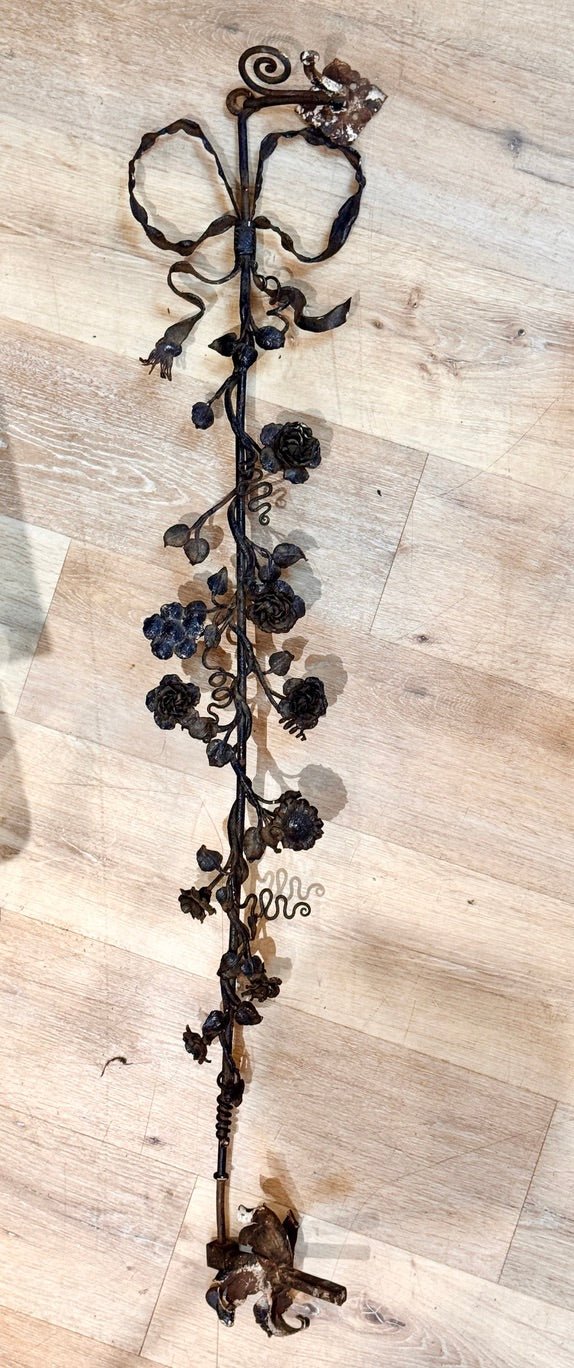 Wrought iron floral mount, France, late 18th to early 19th century. Forged in the form of a ribbon-tied bouquet with roses, tendrils, and buds, likely intended as an architectural or furniture mount. A refined example of French ironwork in the Rococo to early Romantic taste, combining botanical realism with ornamental structure.