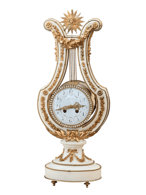 French Louis XVI-Style Gilt Bronze & Marble "Jeweled" Lyre Mantel Clock, late 19th century the case with sun mask surmount above floral swags and laurel mounts, brass 8-day time and strike movement with gridiron pendulum, signed "A.D. Mougin"