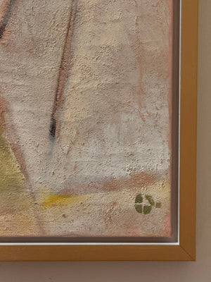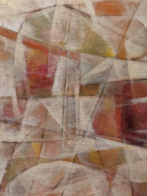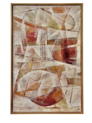 A luminous mid-20th century abstract painting in oil, Paris, composed of layered geometric forms in soft ochres, burgundy, and blush on a textured ground. The play of light and shadow suggests motion and depth within a restrained palette. Signed lower right with a stylized monogram. Elegantly framed and evocative of postwar European abstraction. This also works well hung horizontally.