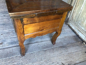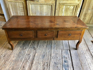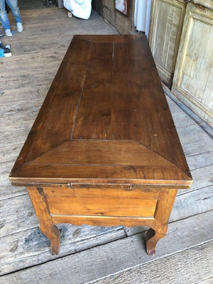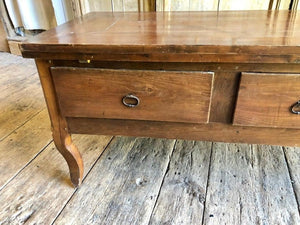A mid-18th century French table with three large drawers on cabriole legs, having been converted to a dining table with ingenious pull-out leaf extensions on the sides. Cherrywood and oak. 29.5" h. x 77.5" w. x 49" d.