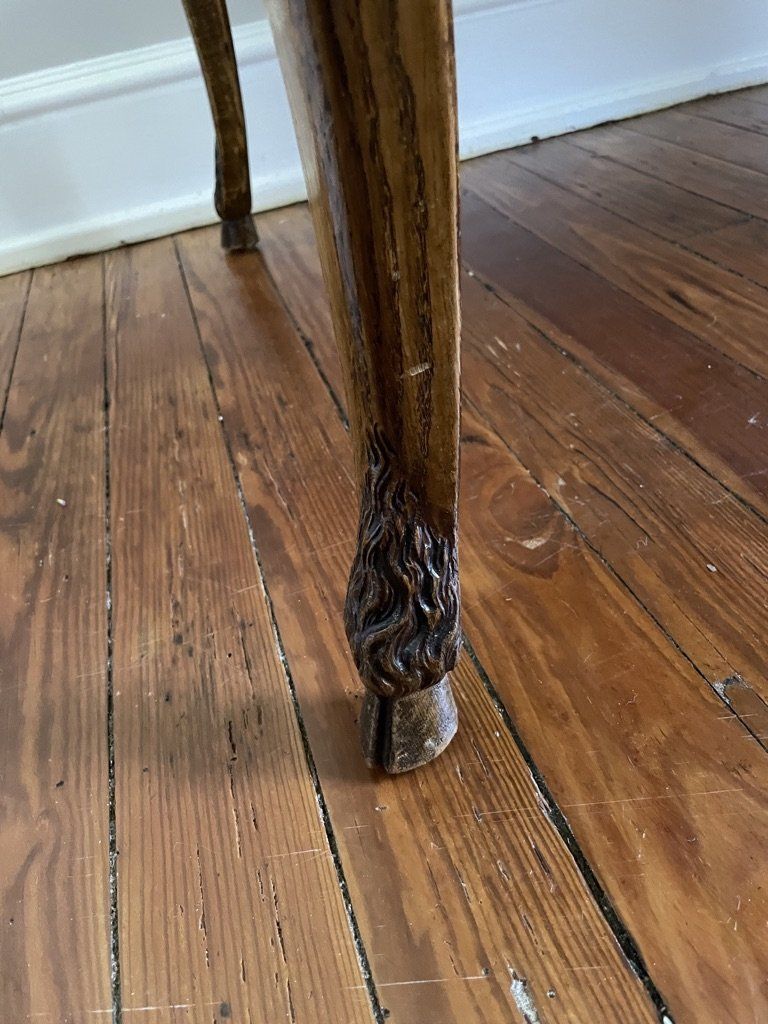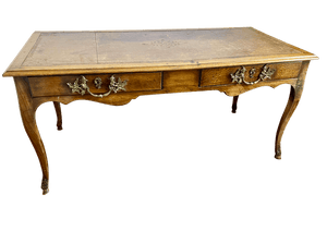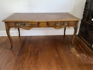 Louis XV Provincial Bureau Plat, 19th Century desk. A French country bureau plat desk in oak with inset tooled leather top, three drawers in the scalloped apron on slender cabriole legs over carved hoof feet. Bronze Chinoiserie drawer pulls and escutcheon. Original locks. Nicely paneled and finished on reverse with faux drawers to face into a room if required.