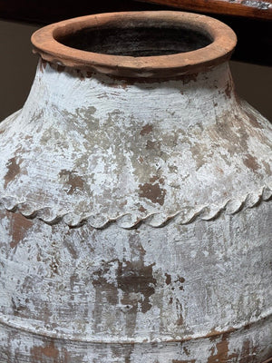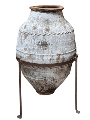 An 18th century Anatolian terracotta storage jar with applied wavy banding and remnants of old whitewash, suggesting long use and age. Originally for olive oil or grain, now a sculptural element with striking surface texture. Presented in a custom iron stand. Turkish, Ottoman Empire. Mounted in a later iron stand. 36” h. in stand 30” no stand, 19” diam.