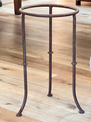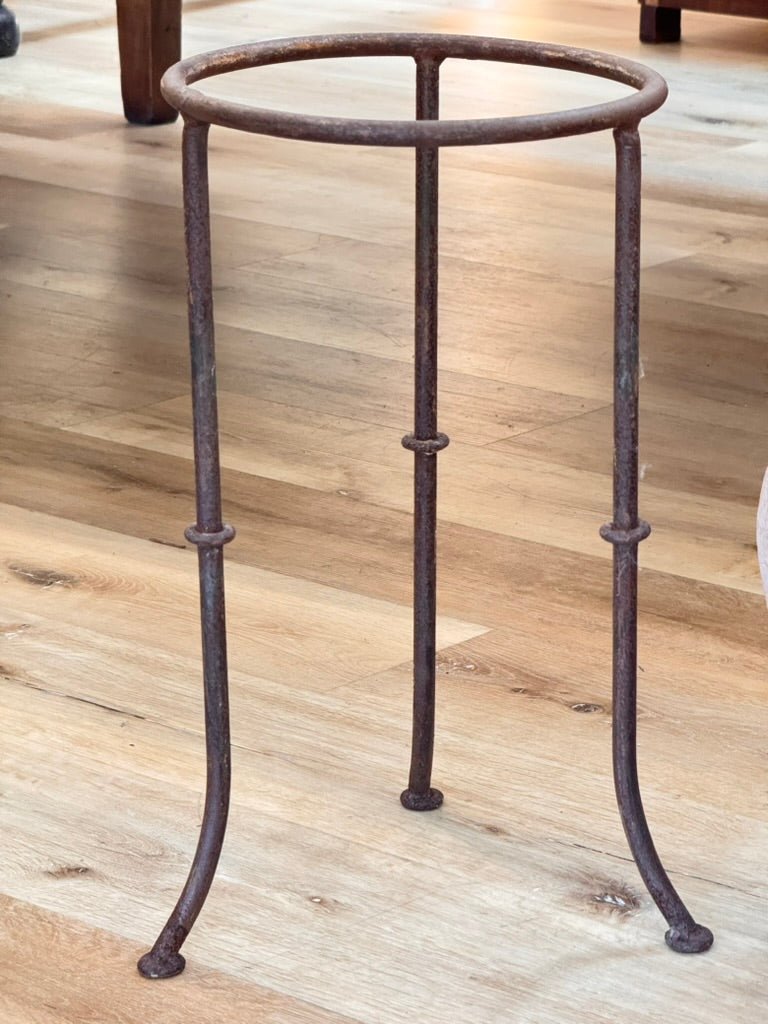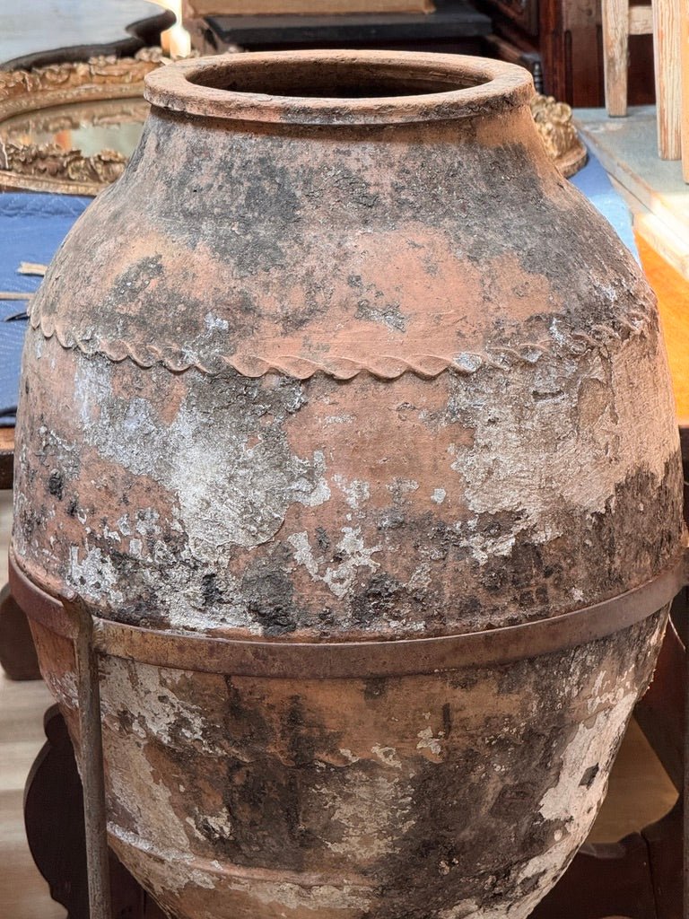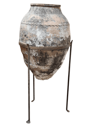 An early Anatolian terracotta storage jar, likely 18th century or earlier, with a tapered base, wavy applied collar, and richly weathered surface. Mineral accretions suggest prolonged outdoor or coastal exposure. Once used for oil or grain, now mounted in a custom iron stand. A sculptural and authentic piece from the Ottoman eastern Mediterranean. 48” h. in stand, 32” no stand. 23” diam