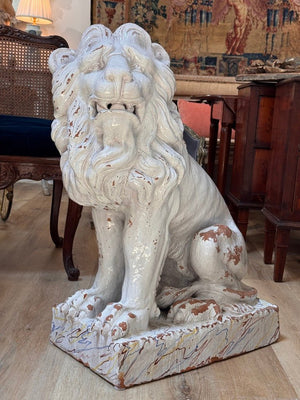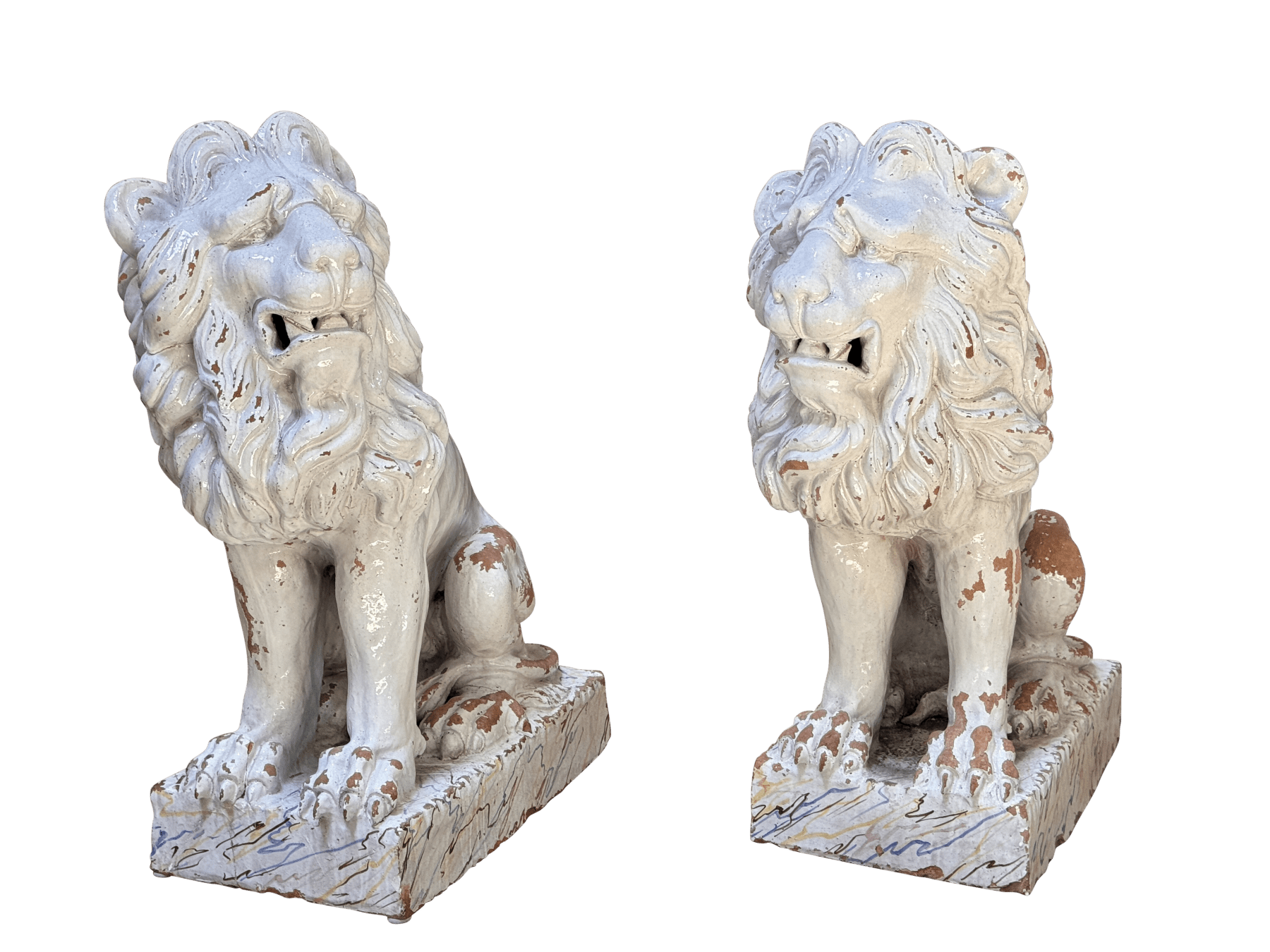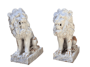 A striking pair of late 18th century terracotta lions from Naples, retaining their original polychrome. Expressively modeled with bold manes and stylized faces, they reflect the theatricality of Southern Italian Baroque sculpture. Mounted on original painted plinths, with appealing surface wear from age and exposure. Rare at this scale and condition.
