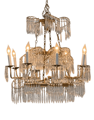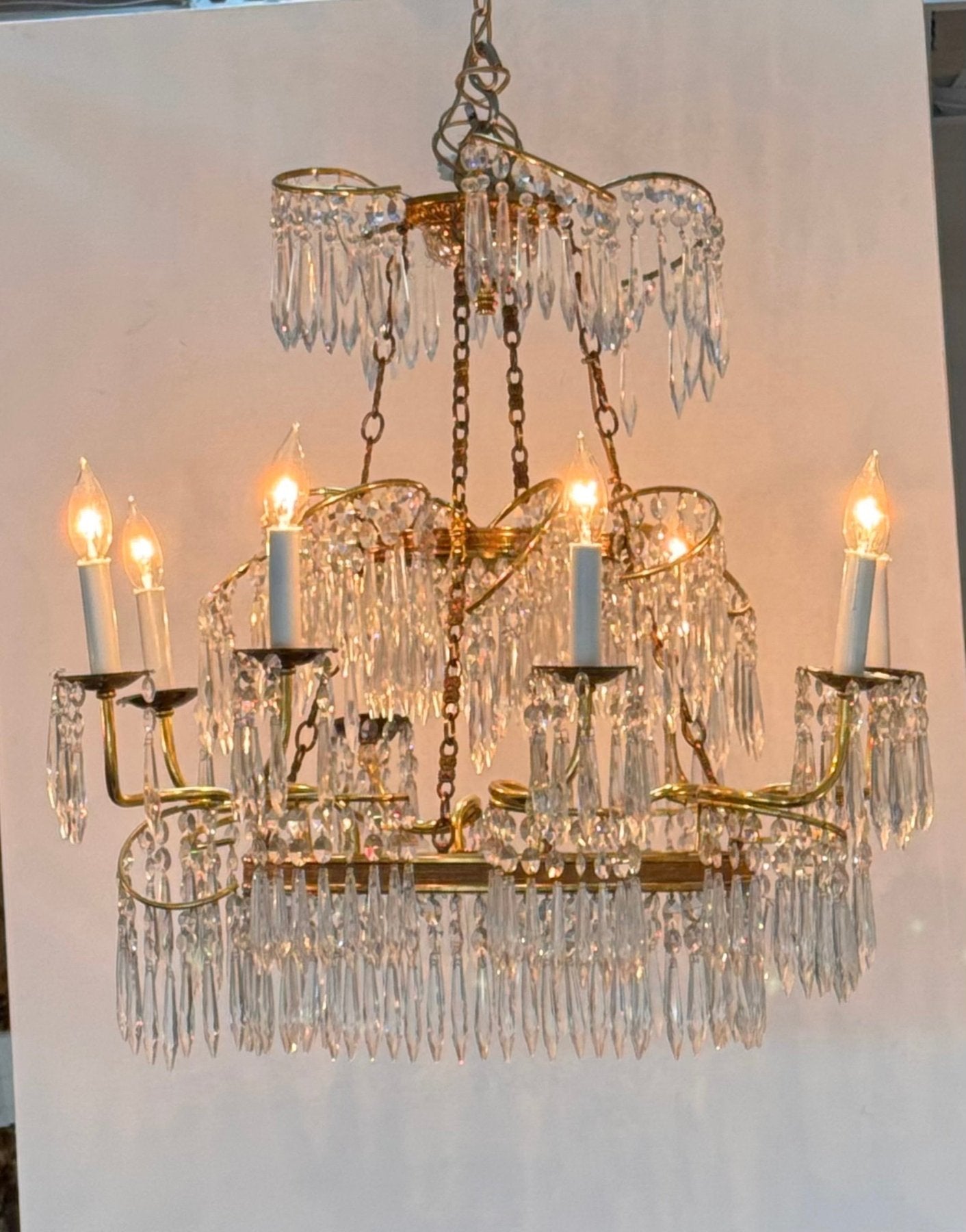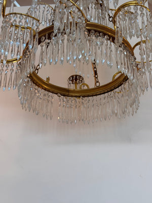 Swedish or Russian chandeliers, gilt bronze and crystal, 19th Century. Sold as pair or separately. Three tiers having eight lights. $3500/pair, $1995 each.