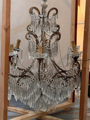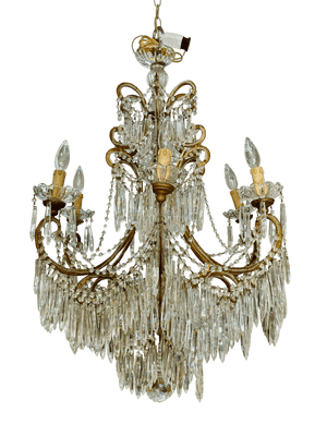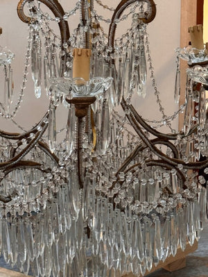 Italian Crystal and gilt iron chandelier, late 19th-early 20th Century, richly draped in cut crystal prisms and beads over a gilded iron frame with scrolling arms and six elegant candle-form lights. The layered arrangement of drops creates a cascading, jewel-like effect, culinating in a faceted crystal sphere. Recently rewired for modern use.