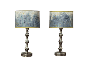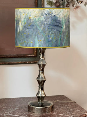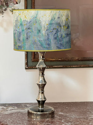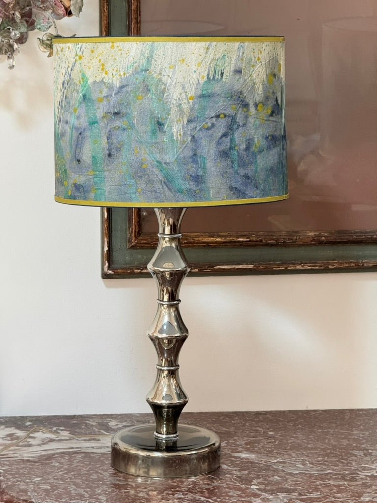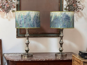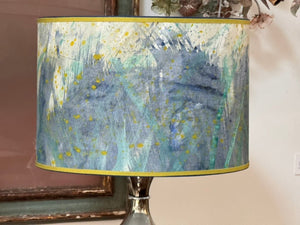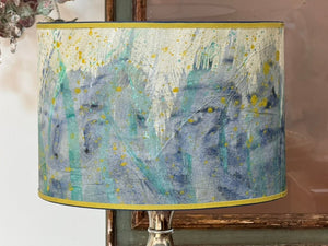 Pair of hand-painted parchment drum lampshades, blue, teal, chartreuse, having chartreuse grosgrain trim. Priced as a pair.Top and bottom diam 16”, height 11” $1440/pair