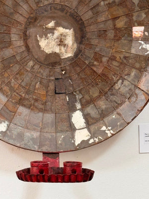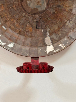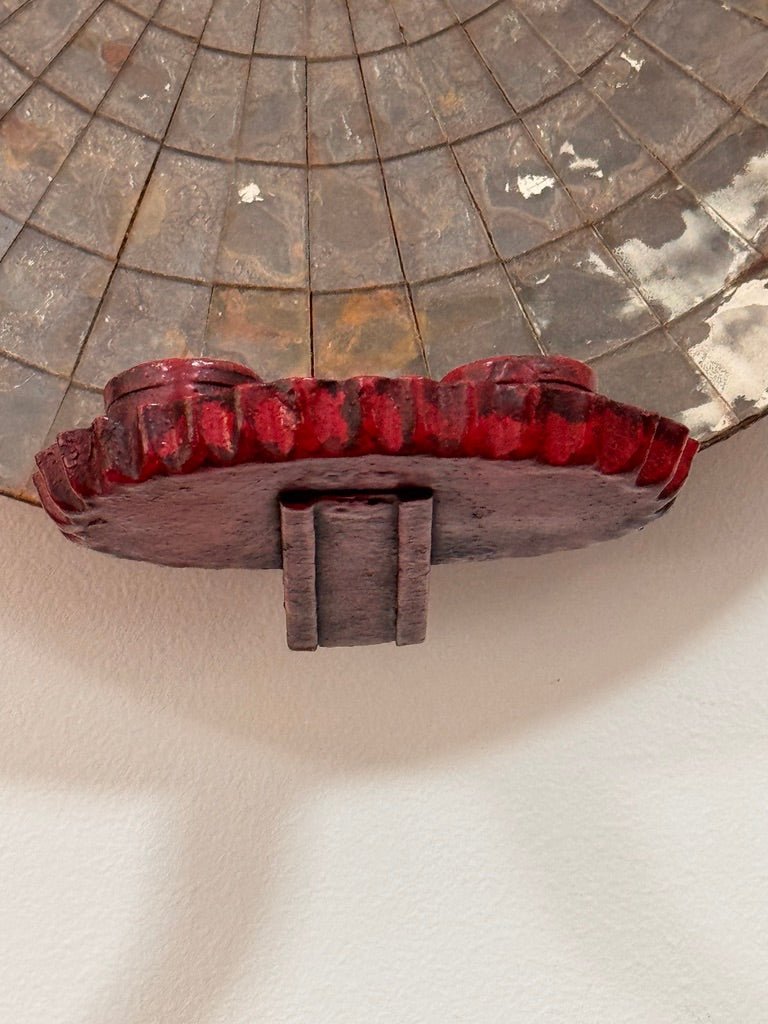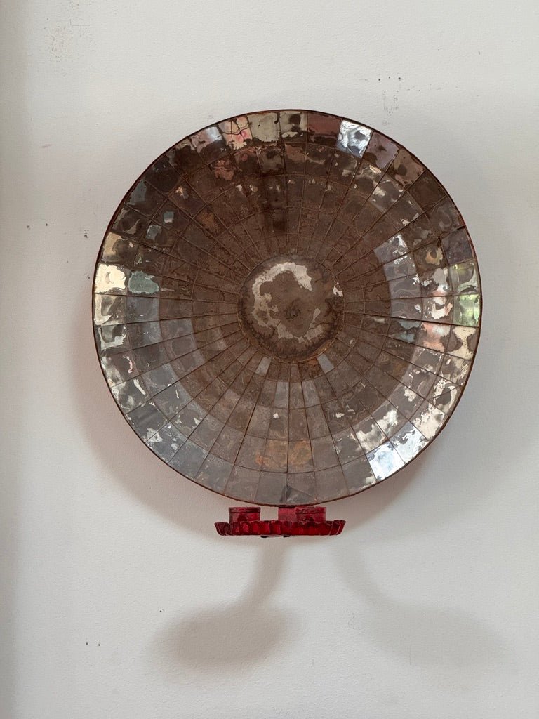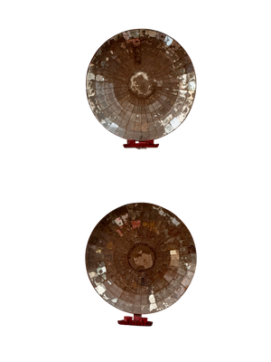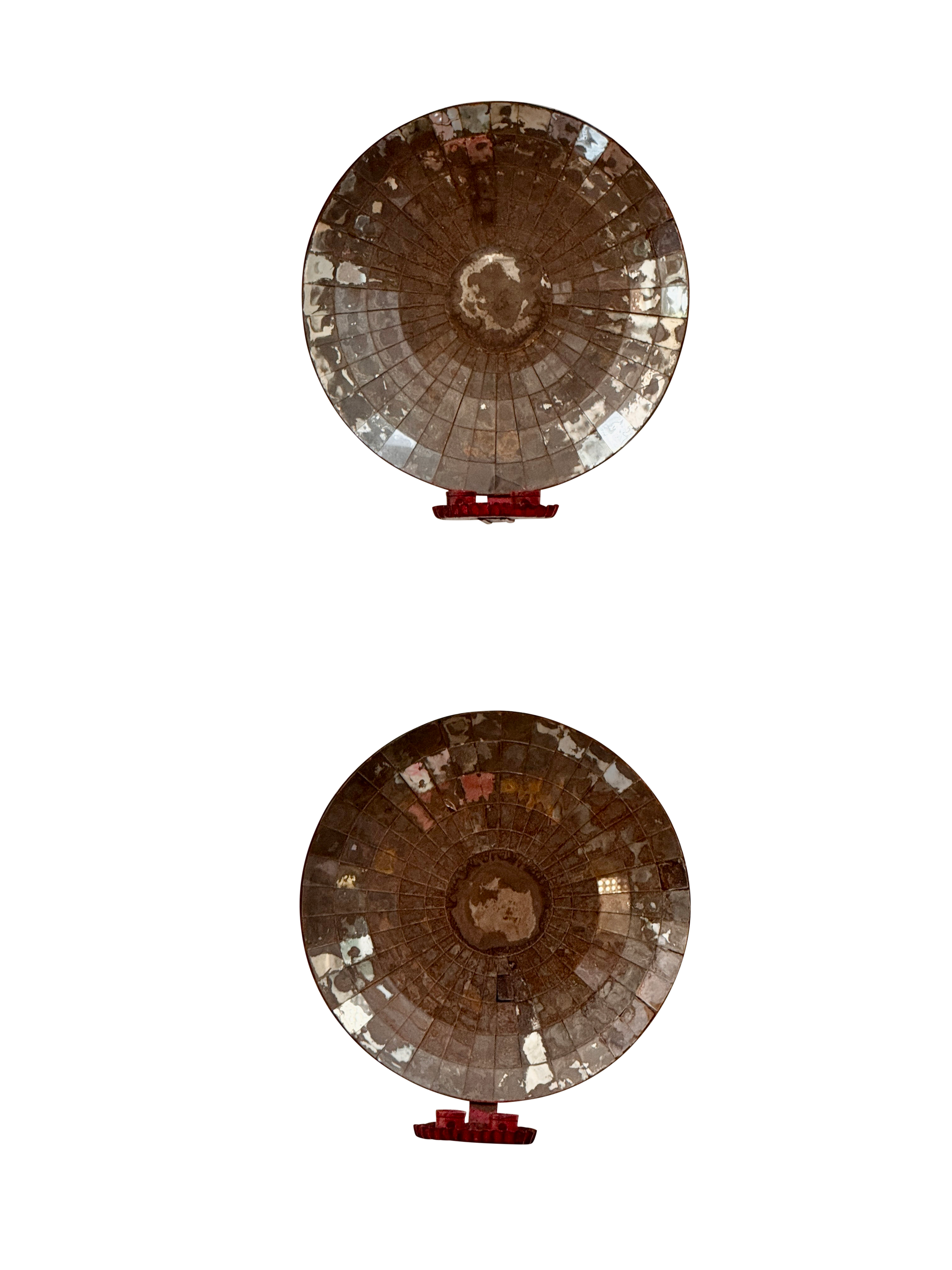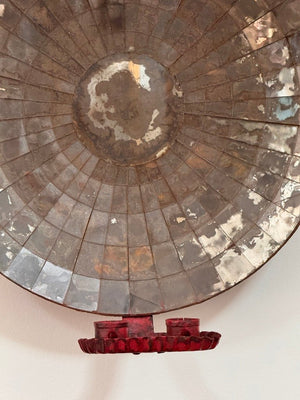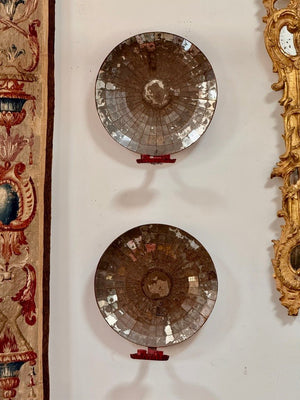 A striking pair of late 19th-century wall sconces. featuring mirrors composed of individually cut and set rectangular mirror segments. The glass retains its original silvering, now beautifully patinated with age and oxidation. Each piece is mounted with a later red-painted bracket serving as a candle holder, designed to reflect and amplify candlelight in dramatic fashion. 16.5” h. x 15” w