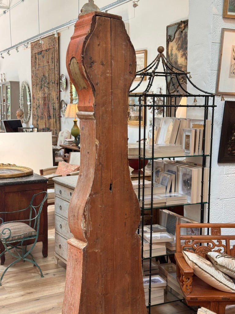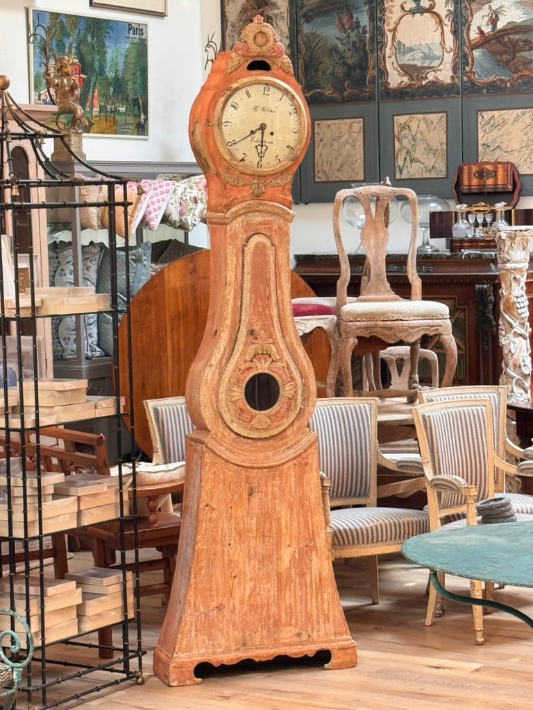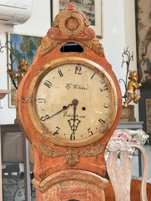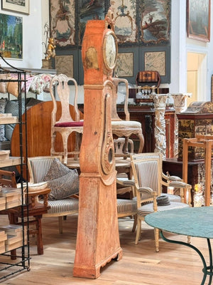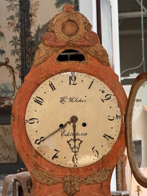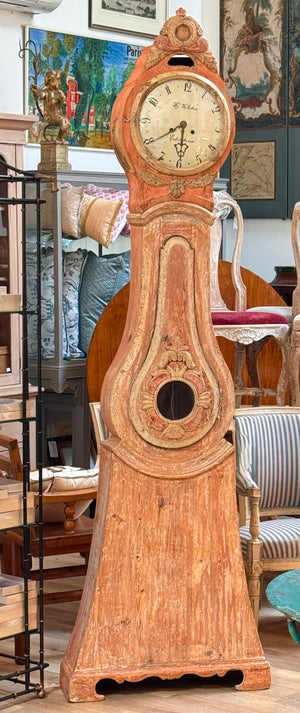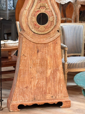 An early 19th century Swedish Mora clock with elegant lyre-form case, richly carved crest and floral medallions, and a deeply scalloped skirt base. Retaining its original salmon-hued paint with gilt accents, and signed, this piece exemplifies the refined provincial craftsmanship of the Gustavian era. Retains original works, and is in working condition. 91”h. 27.5” w. x 9” d.