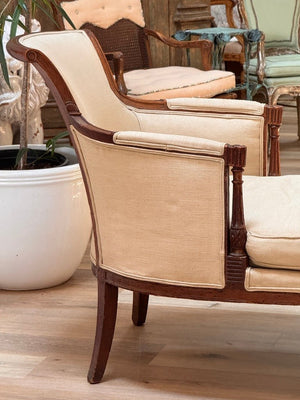 Fine Duchesse Brisée, or recamier, French, Directoire, c. 1800. Comprising two bergères, this form emerged in the late 18th century as a modular chaise alternative. Carved mahogany frame with fluted legs and paneled sides. A refined example of the type, balancing comfort with neoclassical restraint. Upholstered in cream raw silk. 35 1/2 x 28 x 44 in. (90.2 x 71.1 x 111.8 cm.) and 30 x 28 x 37 in. (76.2 x 71.1 x 94 cm.); Seat height including cushion: 18 in.