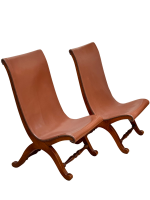 Pair of mid-century Spanish Leather and Walnut Low Lounge Savanarola Chairs Mid-20th Century Campeche form made in Spain by W. Valenti (marked) featuring sculpted walnut bases and saddle-stitched cognac leather slings with nailhead trim.. 35.5” h. x 22” w. x 25” d. SH 15.5” $1420/pair