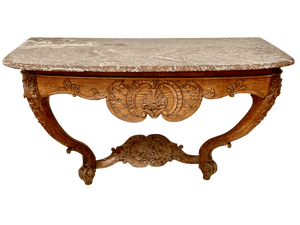 French Louis XV Carved Oak Console with Marble Top, Circa 1750. A boldly carved Louis XV console table in oak, retaining its original shaped rouge royal marble top, France, circa 1750. The serpentine apron features finely detailed shell and trellis motifs centered by a carved palmette, with scrolling acanthus supports and an exuberant stretcher medallion. Strong Rococo movement and deep relief carving throughout. Provincial in origin, yet executed with notable sophistication. 31 x 51 x 26 1/2 in.