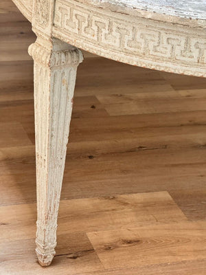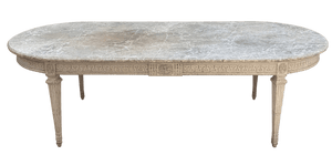 A carved and painted oval dining table in the Gustavian style, Sweden, late 19th century-early 20th Century, featuring Greek key apron, rosette-carved corner blocks, and fluted legs. The painted wood top is expertly faux-marbleized in soft gray tones. 30.5” h. x 103” w (8’ 7”), 45.7” d.