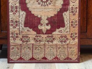 An Ottoman Velvet Cushion Cover, framed, Bursa or Istanbul, 17th/early 18th Century. the raspberry field with a cusped rondel flowerhead anchor medallion enclosed by spandrels of tulips and pale wheat borders of pomegranates and plants, the ends with multiple niches, mounted and framed . 43.25” h. x 24” w.