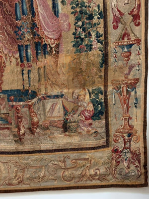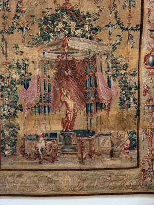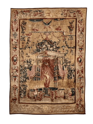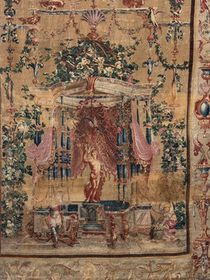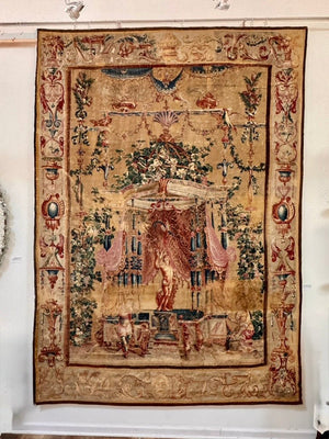 Stunning French Tapestry, c. 1700. Les Grotesques: L'Offrande a Bacchus, Beauvais manufactory; circa 1688-1732, Designed before 1688 by Jean-Baptiste Monnoyer (1636-1699)under the inspiration of Jean Berain (1640-1711), Dessinateur de la Chambre et du Cabinet du Roiwithin the Administratiode 1'Argenterie, Menus-Plaisirs et Affaires de la Chambre du Roi 1674); border designed by Monnoyer and Guy-Louis Vernans (1648-1729). Woven between circa 1688 and 1732,.MATERIALS Wool and silk. See pp. 72-79 French Tapestries & Textiles, The Getty Museum. Height: 10' 0" Width: 7' 2